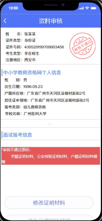 (2)中小学教师资格考试网信息正确,教资面试资料审核程序中信息错误。教资面试资料审核程序中显示“审核不通过”为审核失败,同步显示审核不通过原因,中小学教师资格考试网中显示“待审核”状态。根据审核不通过原因仅需在教资面试资料审核程序中提交修改材料即可。