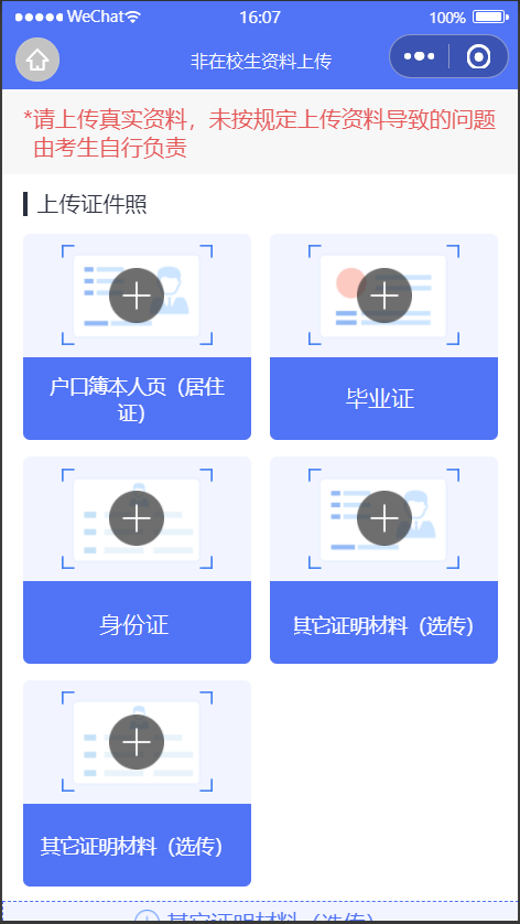 2.需要上传户口簿(户主页和本人页)、身份证(身份证正反面)、毕业证等其他图片证明材料。