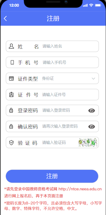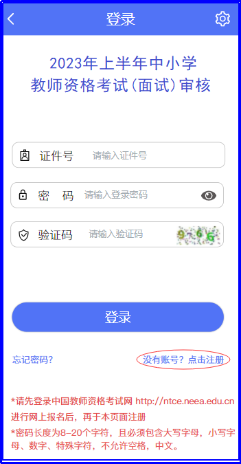 3.未注册账号的考生,点击登录页的“还没有账号?点击注册”链接,进入注册页面,按页面上的要求填写注册信息。登录时,须输入证件号、密码,以及验证码。