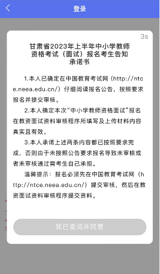 2.入系统后,考生应仔细阅读“考生告知承诺书”,点击“我已阅读并同意”进入系统“登录”页。