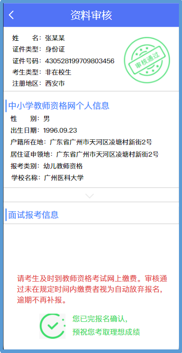 1.教资面试资料审核程序中显示“审核通过”,待中小学教师资格考试网中同步显示‘审核已通过’后及时完成缴费为报名完成。